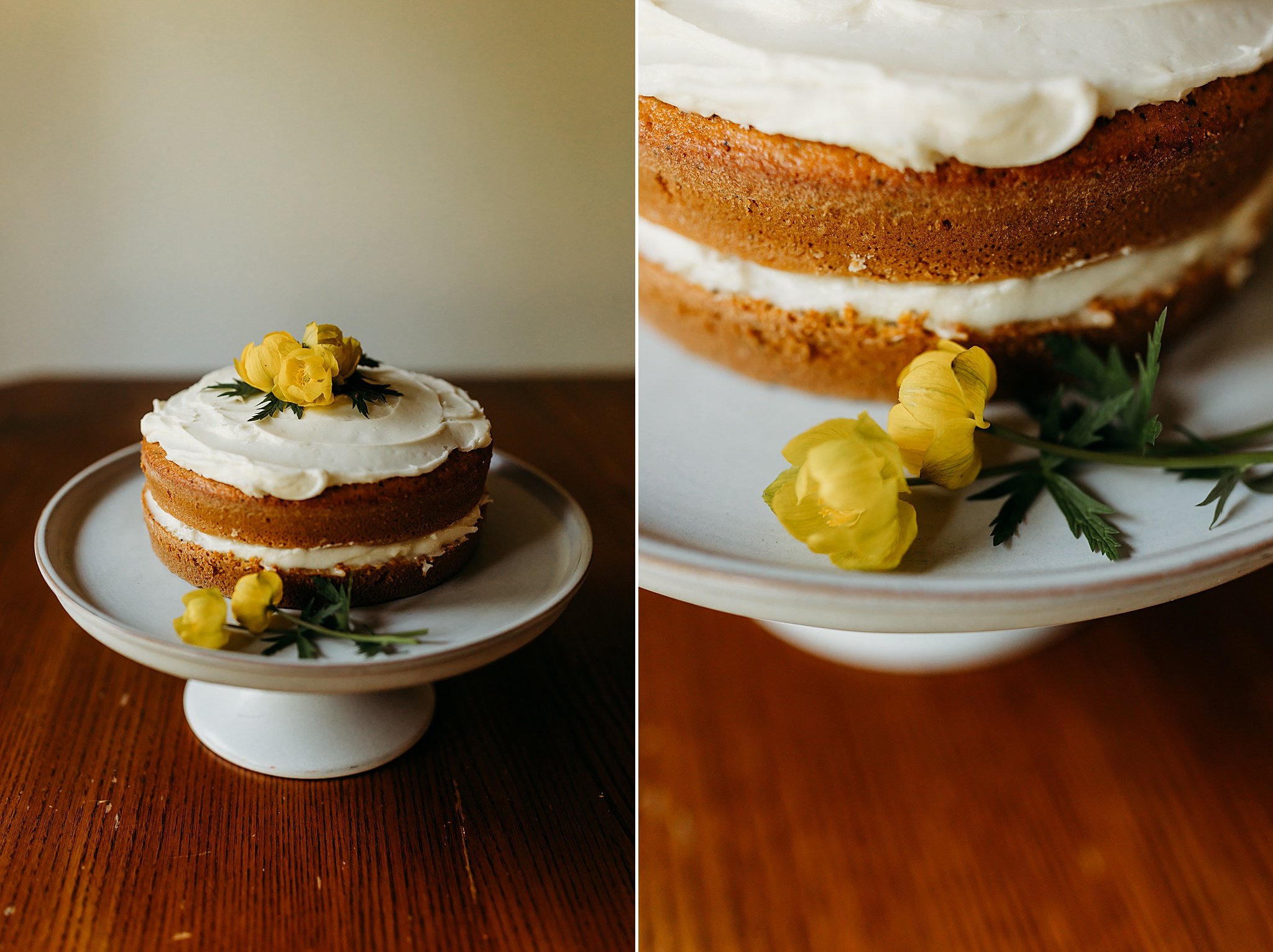 As a connoisseur of many hobbies, when a bride reached out to me about photographing her elopement here in Eagle River, Alaska and then asked if I would also be interested in making a little cake for them, I was happy to say yes! This almond poppyseed cake with homemade lemon curd and cream cheese frosting was so fun to make (and only took 2 practice runs). Topped with the cutest little yellow flowers I found growing next to our driveway and presented on a thrifted cake plate, this is truly a DIY wedding cake.
